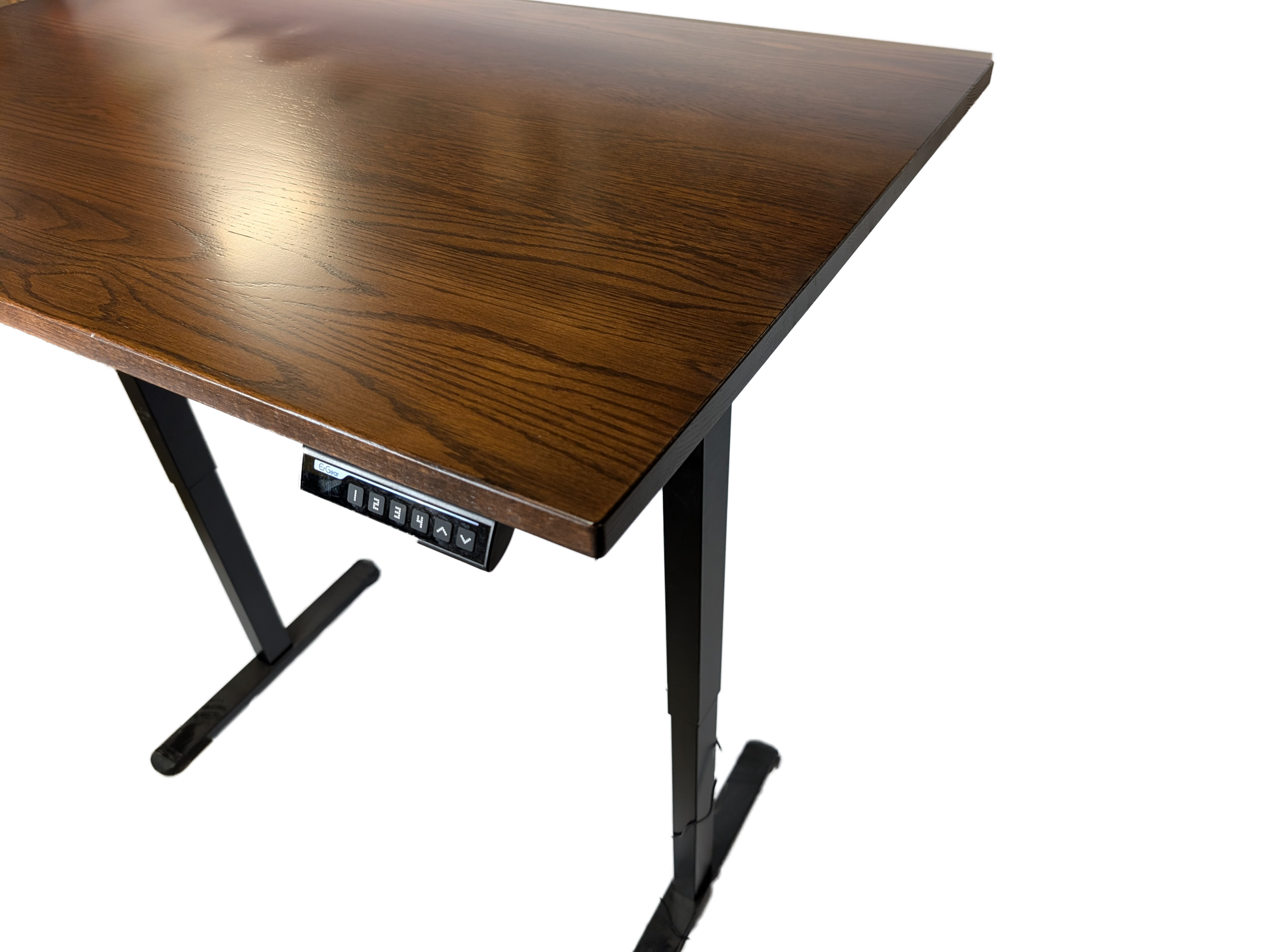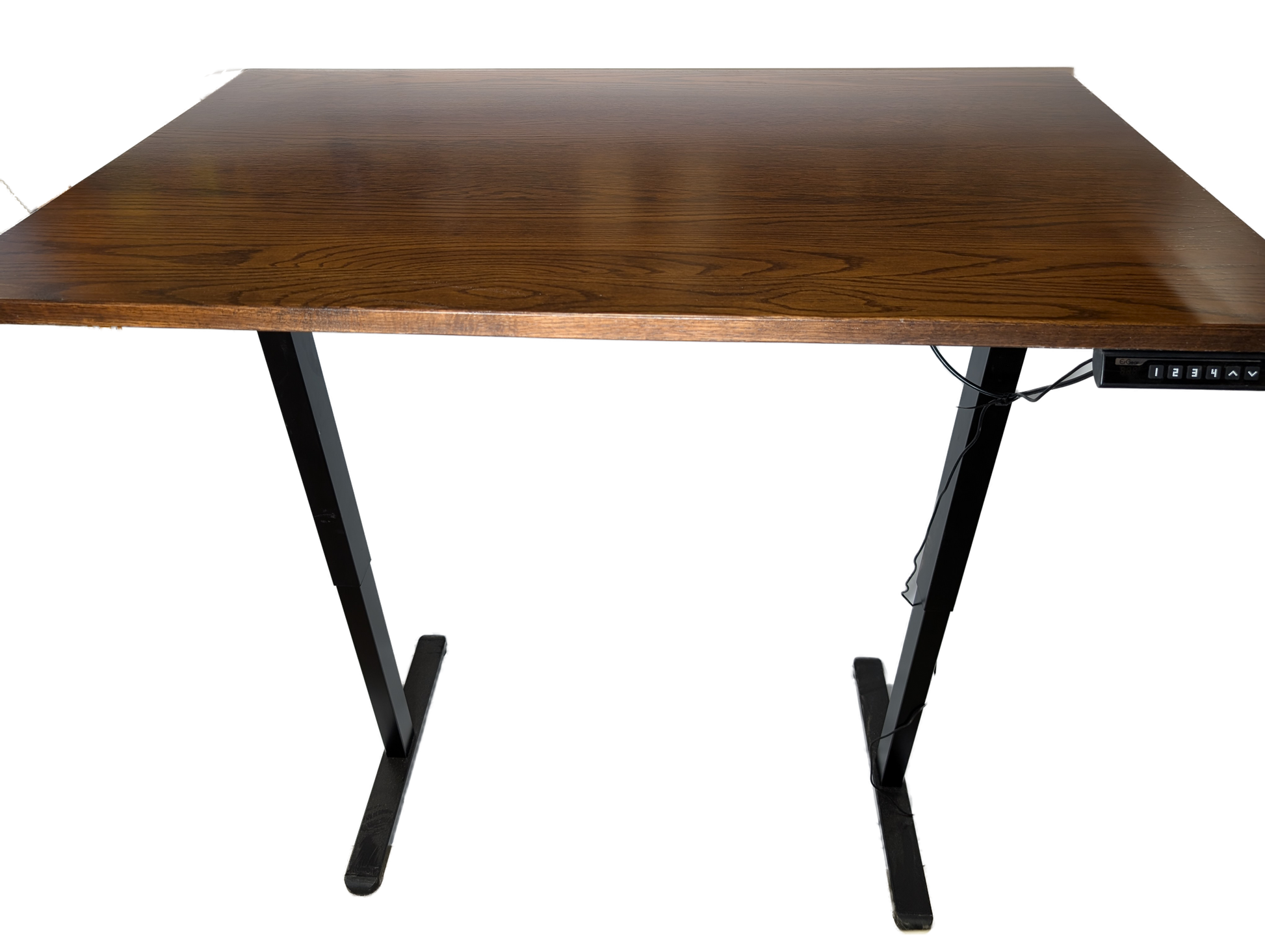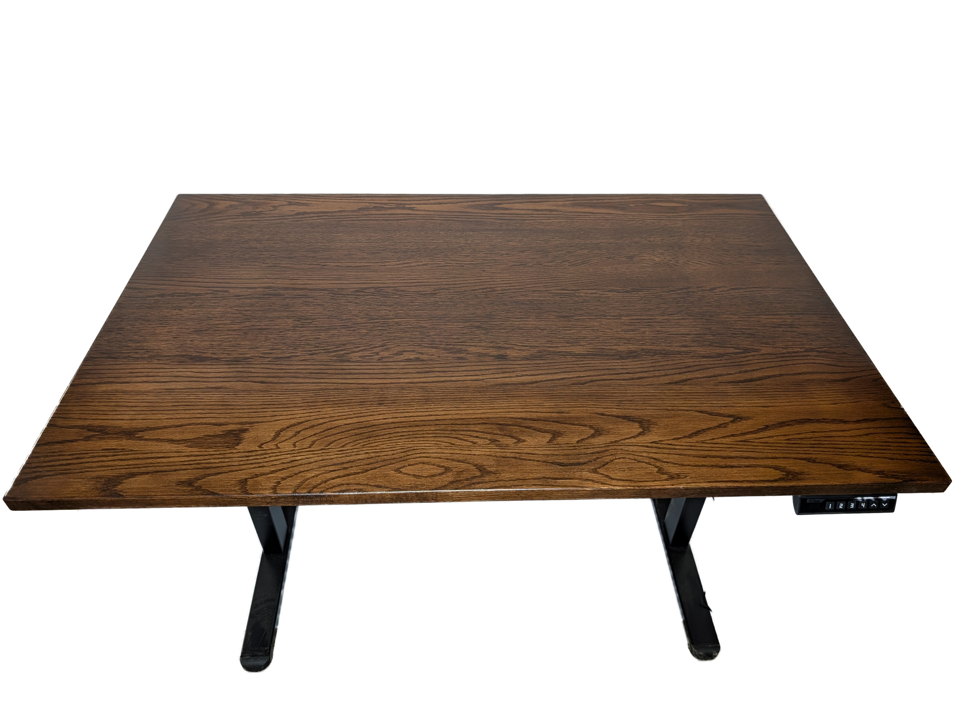 Electric sit, stand desk, made in a range of sizes from 30x48 up to 30x84, height can go from 29" to 47" tall. Wood species available are Red Oak, Maple, and Walnut. Optional add ons are a power strip with top and bottom outlets, a grommet for wire management, and a white base instead of a black one. Stained with Ohio Certified Stains, and high quality conversion varnish. Available in most Ohio Certified Stains.