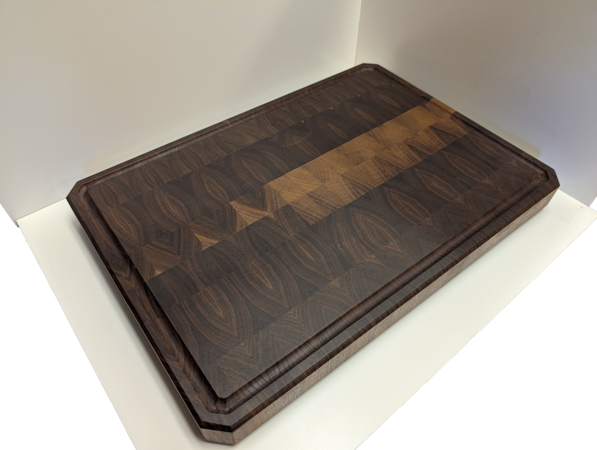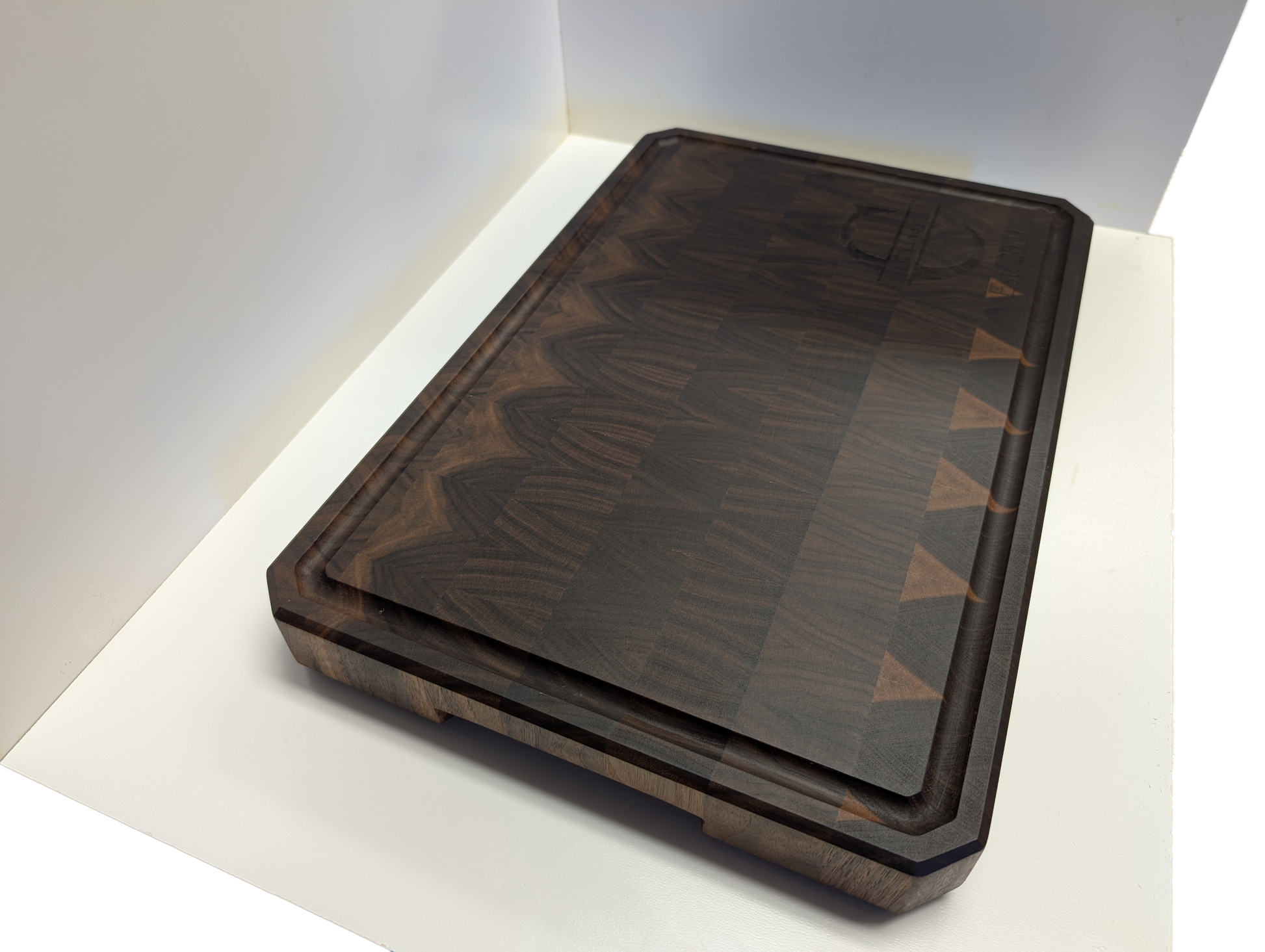 All Walnut end grain cutting boards, available in multiple sizes, and custom sizes, just contact us for a quote on one. Coated with mineral oil and beeswax and rubber feet on the bottom.